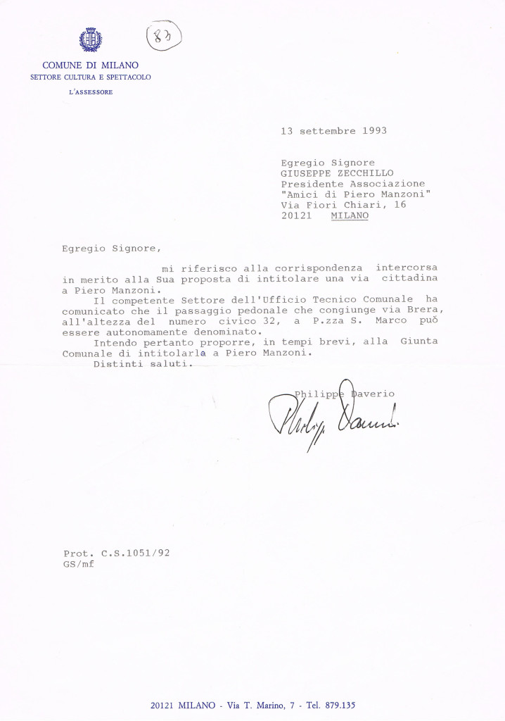 adressé au maire Paolo Pileditri par A amici di Piero Manzoni Association – Le siège social était dans l'étude