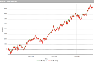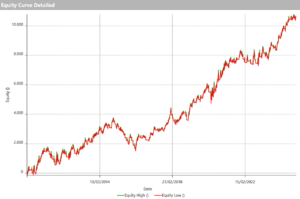 Dans cette version, nous entrerons dans une position longue lorsque le cours de clôture dépasse la clôture haute des 10 dernières barres, et nous clôturerons la position lorsque le cours de clôture tombe en dessous de la clôture basse des 10 dernières barres. Encore une fois, tous les postes seront ouverts et fermés à l’ouverture du prochain bar, une fois les conditions remplies.