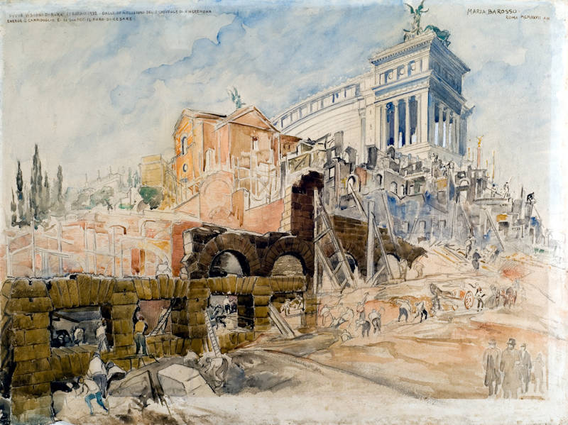 De la basilique de Maxence à l'espace sacré du Largo Argentina, les tableaux de Barosso racontent des épisodes cruciaux : l'excavation de la Velia, une petite colline qui reliait le Palatin et l'Esquilin, supprimée pour faire place à la Via dell'Impero (aujourd'hui Via dei Fori Imperiali) et pour créer une scénographie de célébration par rapport aux grandes prouesses techniques de l'Antiquité ; l'émergence surprenante, parmi les décombres du Largo Argentina, des quatre temples républicains et de la Curie de Pompée, lieu où Jules César trouva la mort ; la démolition de maisons et d'églises médiévales le long de la nouvelle Via del Mare, qui isolait et exaltait les temples du Forum Boarium et du Forum Olitorio.