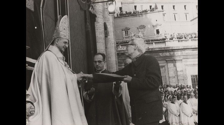 Le pape Paul VI donne à Jacques Maritain le message pour les hommes des sciences et des intellectuels à la fin du Vatican Council II, le 8 décembre 1965, sur le cimetière de la basilique de San Pietro.