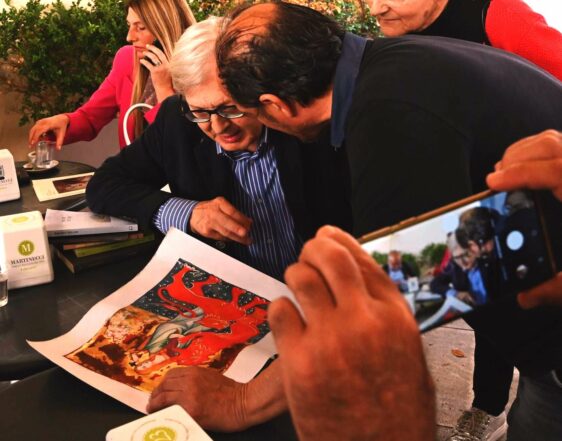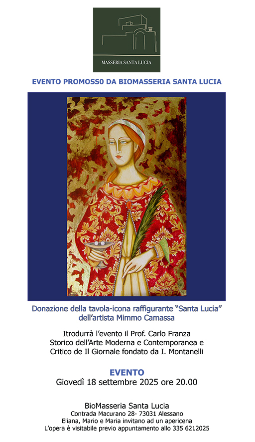 L'image de Santa Lucia, Vierge Sainte et martyr de la tradition catholique. Le Santa Lucia Masseria est situé à Alessano, c'est une Masseria fortifiée du XVIe siècle en bon état, bijou d'archéologie rurale, maintenant revivez – Dal 2023 – grâce à Eliana, Mario et Maria Rummo, comme un endroit idéal pour des vacances et un séjour entre la mer et la campagne. L'événement du don a d'abord trouvé l'exposition du discours de l'historien qui était le créateur du don, qui a parlé de l'œuvre et de l'artiste, en présence d'un public important et de diverses autorités. Les propriétaires de la ferme historique ont ensuite offert un dîner aux personnes présentes.