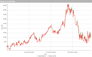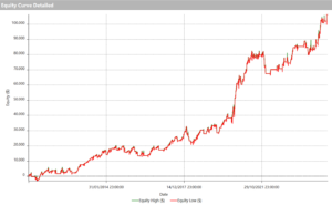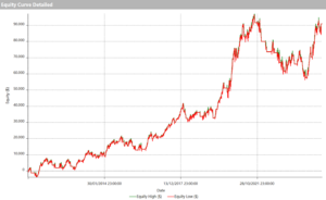 La ligne d'actions de la figure 2 montre que la stratégie a produit un résultat positif à long terme, avec un bénéfice net d'environ 90 000 dollars. Cependant, nous remarquons comment la stabilité a diminué ces dernières années, avec des retraits plus marqués et une plus grande volatilité dans les résultats. Cela suggère que bien que l'approche ait bien fonctionné dans le passé, récemment, elle peut avoir rencontré de plus grandes difficultés à maintenir la même efficacité.