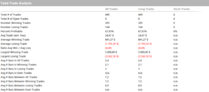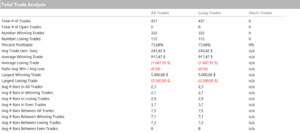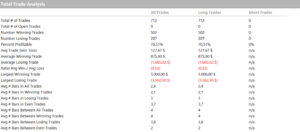 En observant l'analyse commerciale totale de la figure 3, nous notons que la stratégie a effectué 712 opérations, avec un pourcentage réussi de 70%. Cela signifie que dans la plupart des cas, la stratégie a clôturé le commerce de profit.